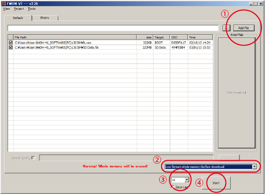 3 アップグレードツール「FWDN_V7_v2.26」を開き、下図①のように、「Add File」からダウンロードした「ADH-41_SOFTWARE(PC)130304.zip」の中身の「lk.rom」「SD Data.fai」を選びます。