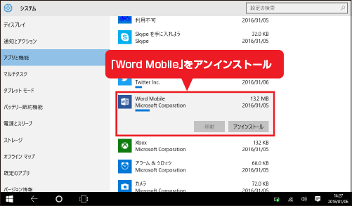 「Word Mobile」「PowerPoint Mobile」も同じ手順でアンインストールします。