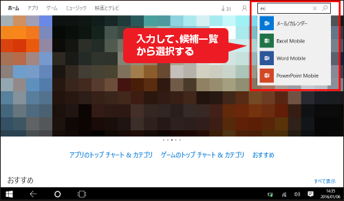 スクリーンキーボードで、「excel」または「word」、「powerpoint」と入力します。候補一覧が表示されるので、「Word Mobile」「Excel Mobile」「PowerPoint Mobile」のいずれかをタップします。